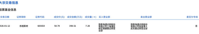 1月12日,彤程新材大宗交易成交7.28万股,成交额398.51万元,占当日总成交额的0.18%,成交价54.74元,较市场收盘价56.66元折价3.39%。
