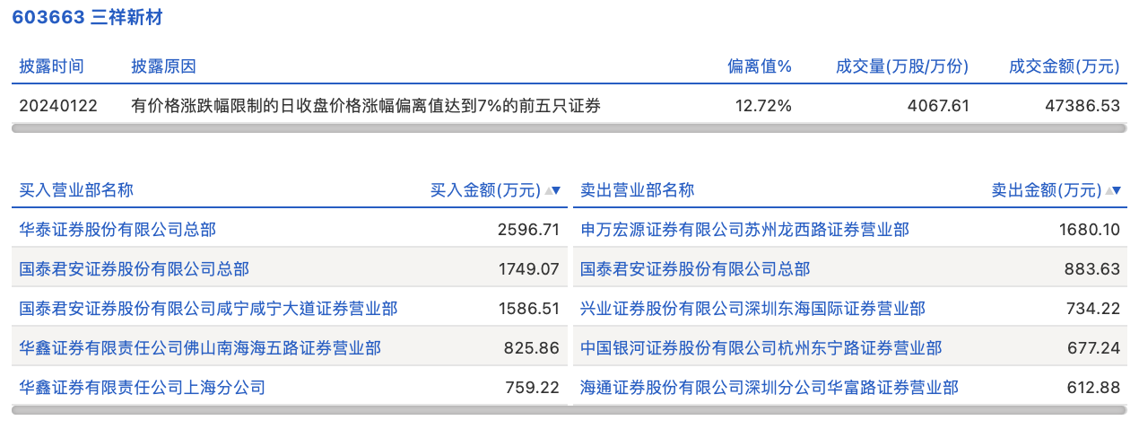 1月22日,三祥新材今日涨停,全天换手率达9.63%,振幅达12.98%。龙虎榜数据显示,营业部席位合计净买入2929.3万元。其中,华泰证券总部、国泰君安证券总部分别买入2596.71万元、1749.07万元;申万宏源证券有限公司苏州龙西路证券营业部、国泰君安证券总部分别卖出1680.10万元、883.63万元。