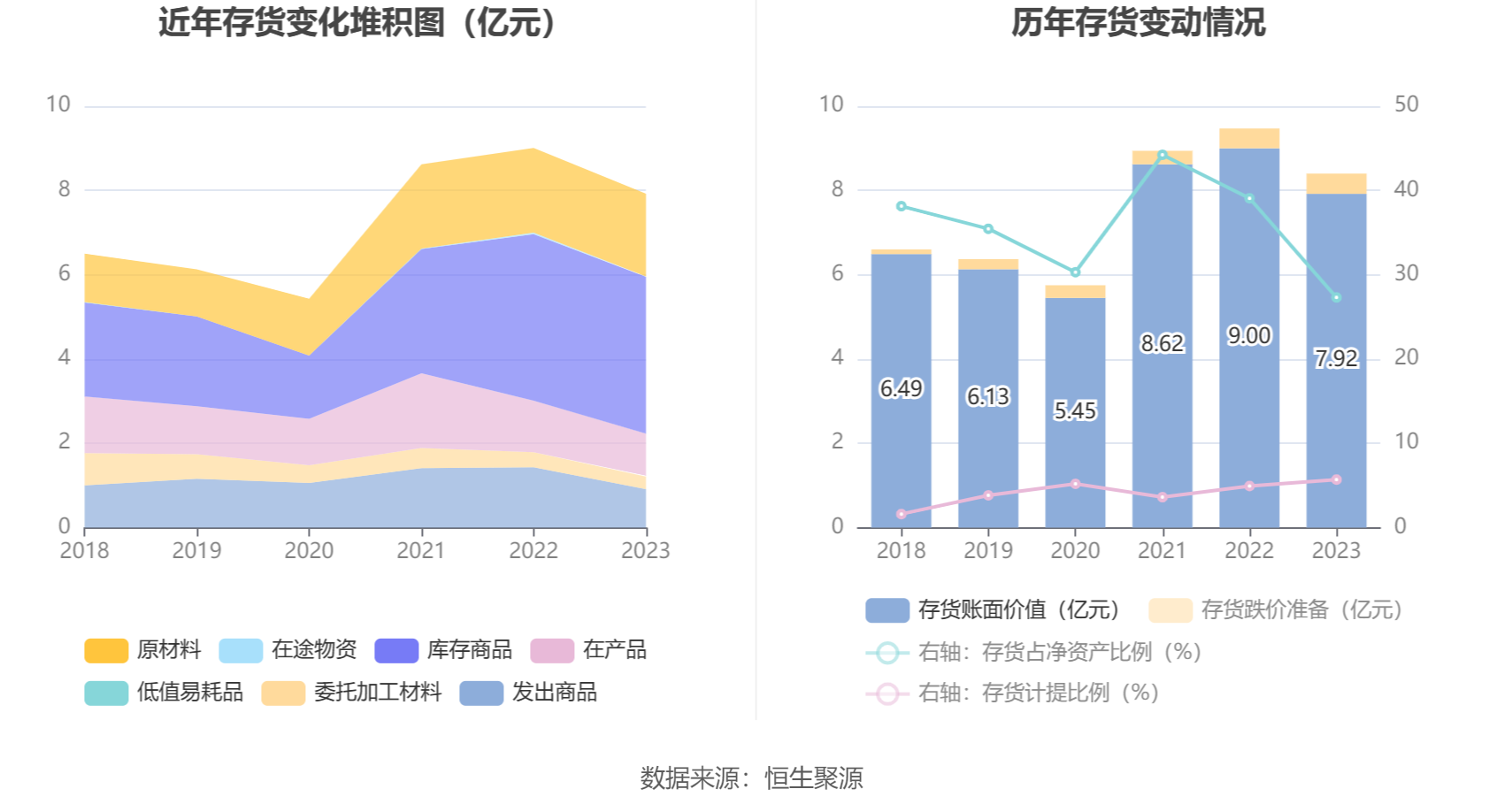 从存货变动来看,截至2023年年末,公司存货账面价值为7.92亿元,占净资产的27.3%,较上年末减少1.09亿元。其中,存货跌价准备为4786.09万元,计提比例为5.7%。