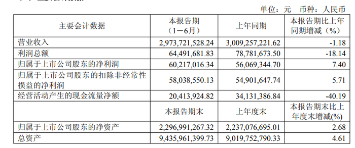 报告显示,天马科技公司上半年营业收入为29.74亿元,同比下降1.18%;归母净利润为6021.70万元,同比增长7.40%;扣非归母净利润为5803.86万元,同比增长5.71%;基本每股收益0.12元。