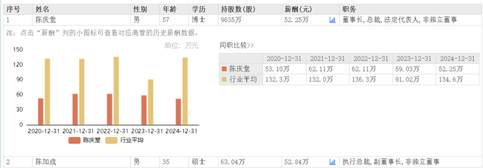 据东方财富网数据,天马科技董事长兼总裁陈庆堂2024年领薪52.25万元,执行总裁陈加成同年领薪52.84万元。