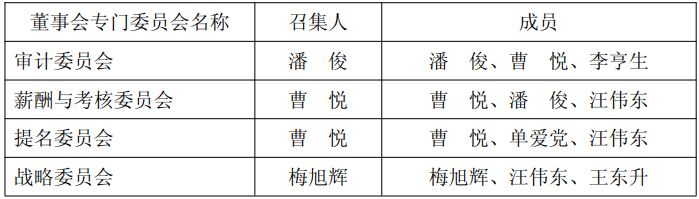 新任董事长为梅旭辉,董事会成员包括梅旭辉、汪伟东、周陈、王东升、李亨生、缪开、单爱党、曹悦、潘俊。董事会专门委员会的组成也已确定,具体表现如下: