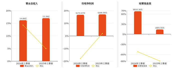 公司营业总收入为15.39亿元,较去年同报告期营业总收入增加7244.91万元,实现2年连续上涨,同比较去年同期上涨4.94%。归母净利润为5268.59万元,较去年同报告期归母净利润增加95.12万元,同比较去年同期上涨1.84%。经营活动现金净流入为1805.55万元。