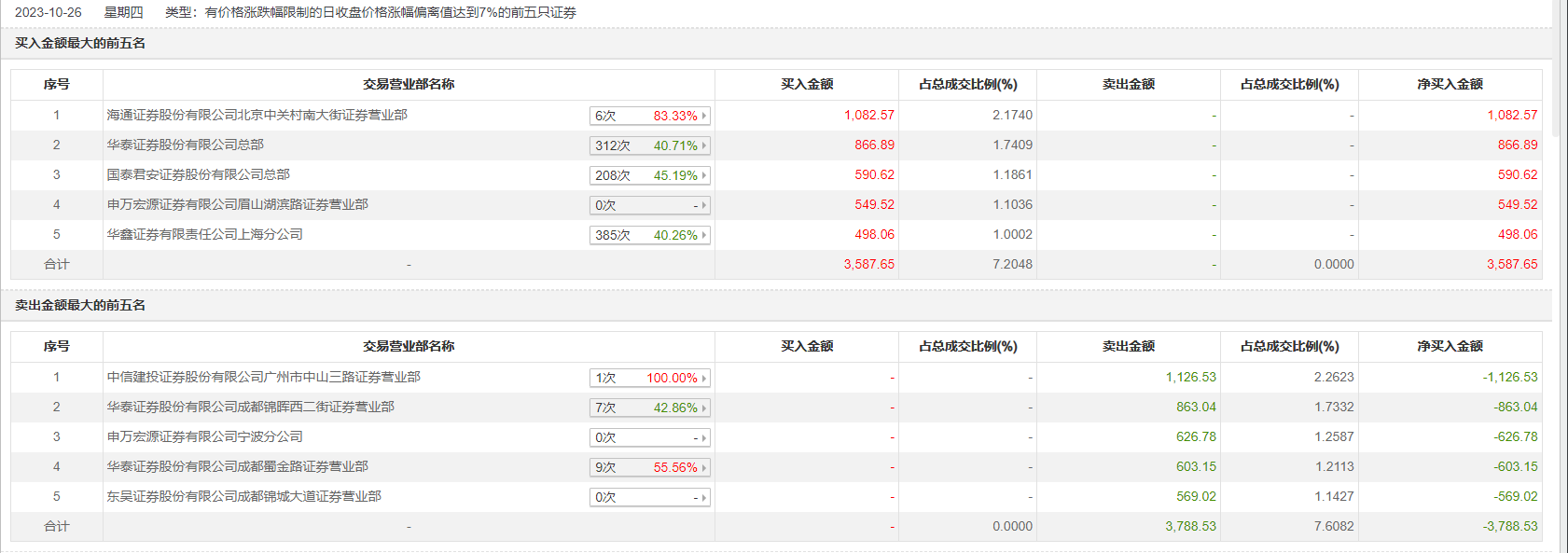 10月26日,华体科技今日涨停,全天换手率达19.1%,振幅达9.61%。龙虎榜数据显示,营业部席位合计净卖出200.87万元。其中,海通证券北京中关村南大街证券营业部、华泰证券总部分别买入1082.57万元、866.89万元;中信建投证券广州市中山三路证券营业部、华泰证券成都锦晖西二街证券营业部分别卖出1126.53万元、863.04万元。