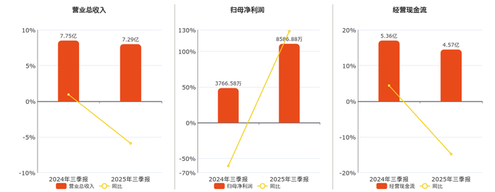 公司营业总收入为7.29亿元,在已披露的同业公司中排名第44,较去年同报告期营业总收入减少4560.71万元,同比较去年同期下降5.89%。归母净利润为8586.88万元。经营活动现金净流入为4.57亿元,较去年同报告期经营活动现金净流入减少7929.43万元,同比较去年同期下降14.78%。