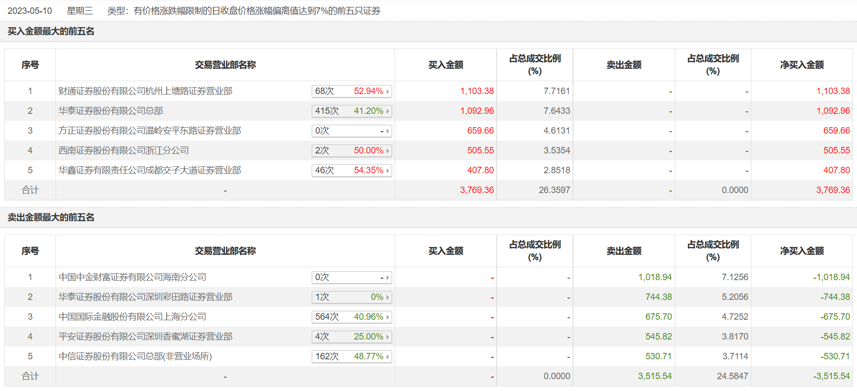具体来看,财通证券杭州上塘路证券营业部、华泰证券总部分别买入1103.38万元、1092.96万元;中国中金财富证券有限公司海南分公司、华泰证券深圳彩田路证券营业部分别卖出1018.94万元、744.38万元。