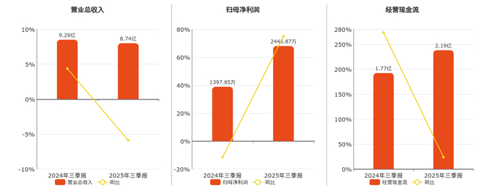 公司营业总收入为8.74亿元,在已披露的同业公司中排名第43,较去年同报告期营业总收入减少5469.62万元,同比较去年同期下降5.89%。归母净利润为2446.87万元,在已披露的同业公司中排名第46。经营活动现金净流入为2.19亿元。