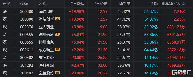 龙虎榜中涉及机构专用席位的个股中,当日净买入额前三为海峡创新、亚太药业、神州信息,分别为2.24亿元、8831.23万元、6368.91万元。