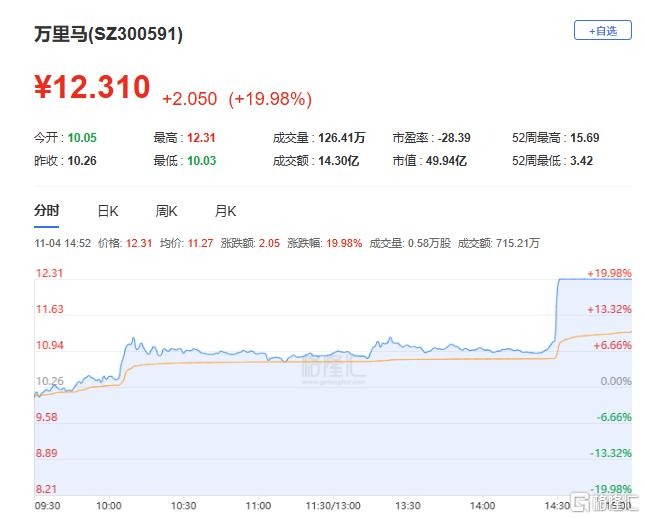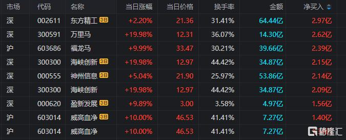 龙虎榜单日净买入额前三为万里马、福龙马、海峡创新,分别为2.62亿元、2.39亿元、2.09亿元。