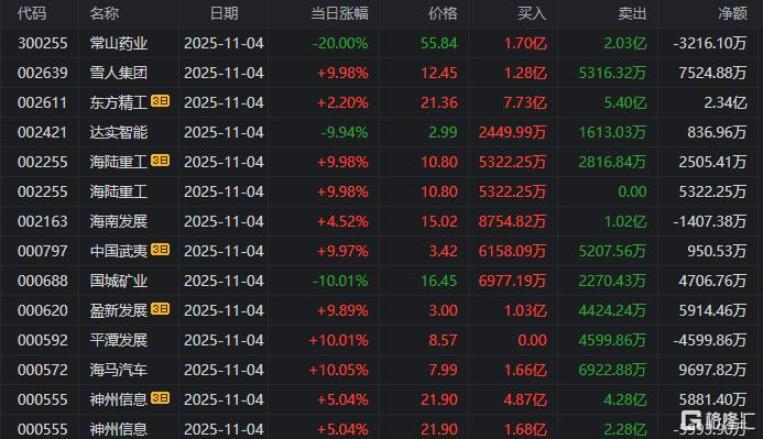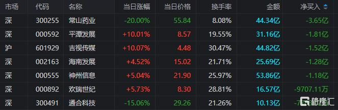 龙虎榜单日净卖出额前三为常山药业、平潭发展、吉视传媒,分别为3.65亿元、1.81亿元、1.52亿元。