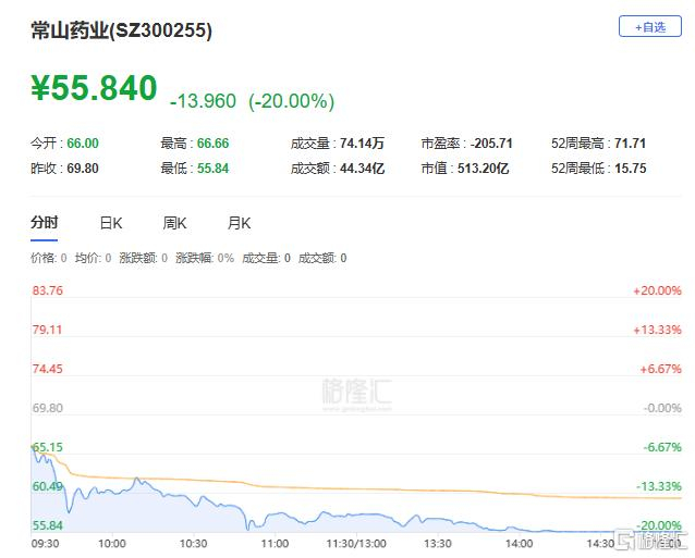 常山药业:今日跌停,全天换手率8.08%,成交额44.34亿元,振幅19.38%。龙虎榜数据显示,机构净卖出5571.36万元,深股通净卖出3216.10万元,营业部席位合计净卖出2.77亿元。