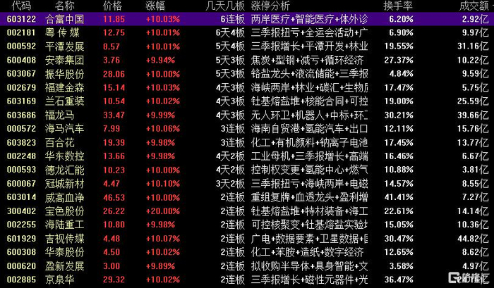 焦点股方面,海峡两岸概念股平潭发展13天10板、合富中国6连板、达华智能9天5板,并购重组的盈新发展12天9板,煤炭股安泰集团14天8板。