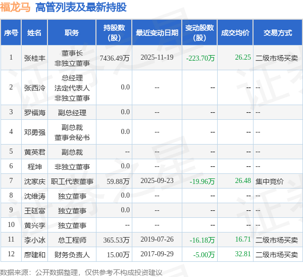 福龙马的高管列表及最新持股情况如下: