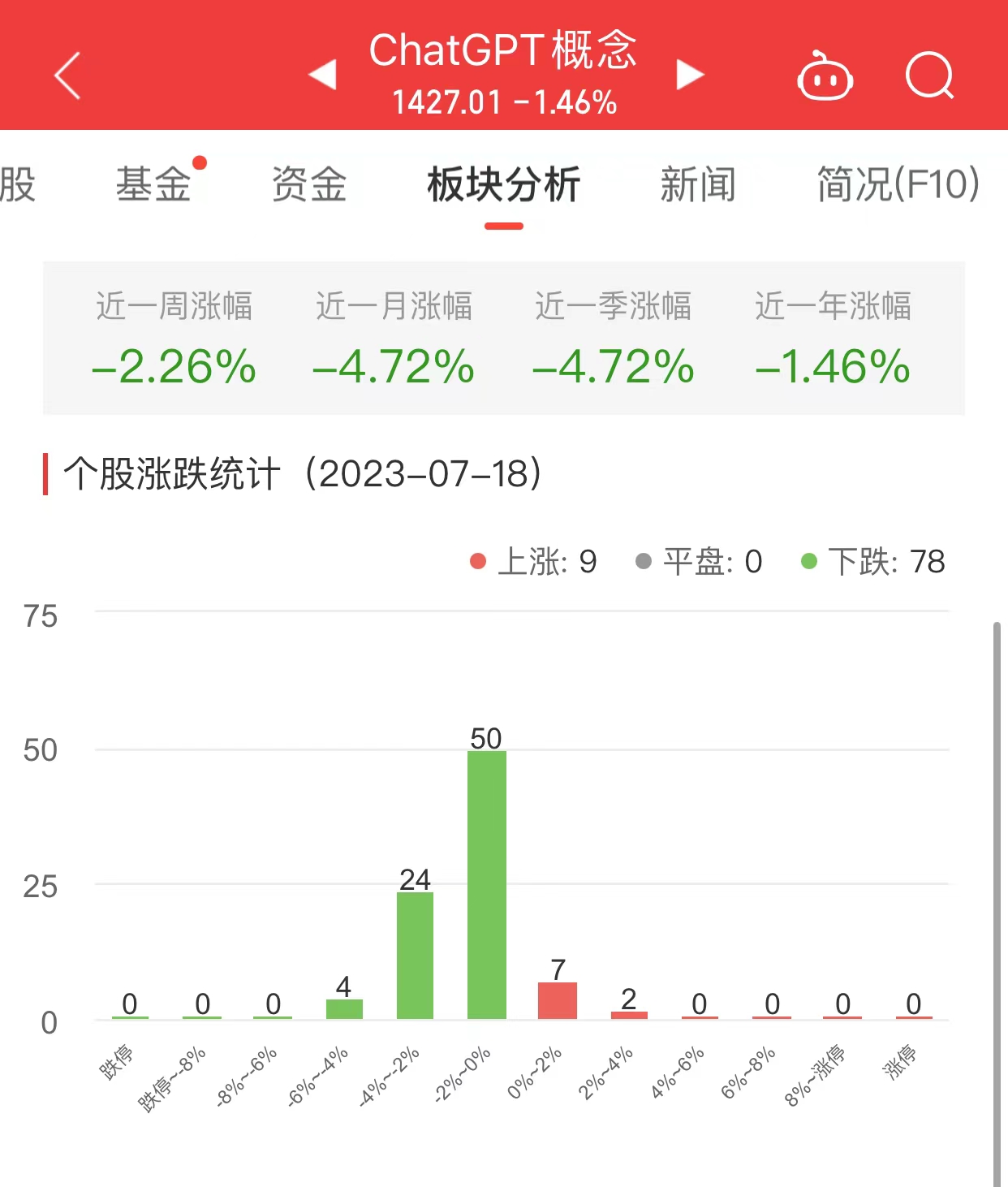 中国经济网北京7月18日讯今日,ChatGPT概念板块整体跌幅1.46%,其中9只股票上涨,0只股票平盘,78只股票下跌。