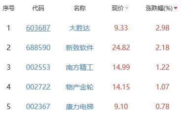 其中,大胜达、新致软件、南方精工、物产金轮、康力电梯位列板块涨幅前五位,涨幅分别为2.98%、2.18%、1.22%、1.07%、0.78%。