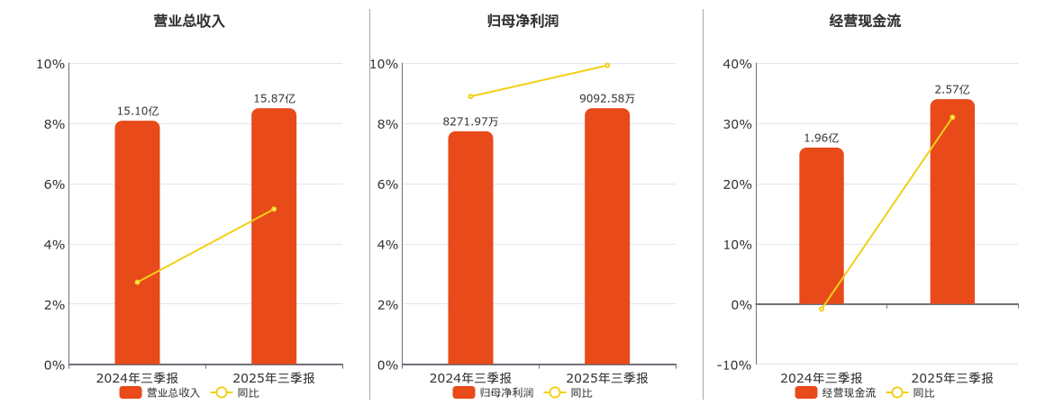 公司营业总收入为15.87亿元。归母净利润为9092.58万元。经营活动现金净流入为2.57亿元。