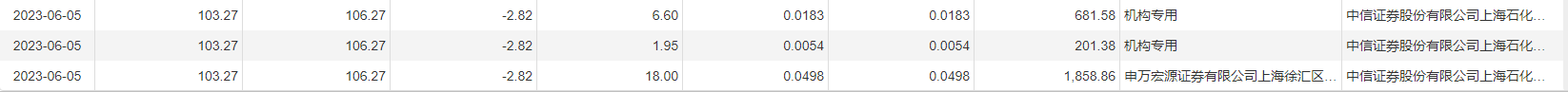 6月5日大宗交易成交361.5万股,成交额3.73亿元,占当日总成交额的49.84%,成交价103.27元,较市场收盘价106.27元折价2.82%。
