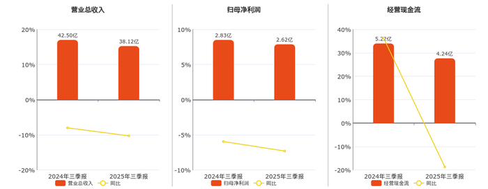 公司营业总收入为38.12亿元,在已披露的同业公司中排名第8,较去年同报告期营业总收入减少4.38亿元,同比较去年同期下降10.30%。归母净利润为2.62亿元,在已披露的同业公司中排名第7,较去年同报告期归母净利润减少2068.39万元,同比较去年同期下降7.31%。经营活动现金净流入为4.24亿元,在已披露的同业公司中排名第8,较去年同报告期经营活动现金净流入减少9754.77万元,同比较去年同期下降18.70%。
