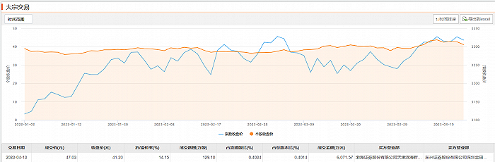 4月13日大宗交易成交129.1万股,成交额6071.57万元,占当日总成交额的12.37%,成交价47.03元,较市场收盘价41.2元溢价14.15%。