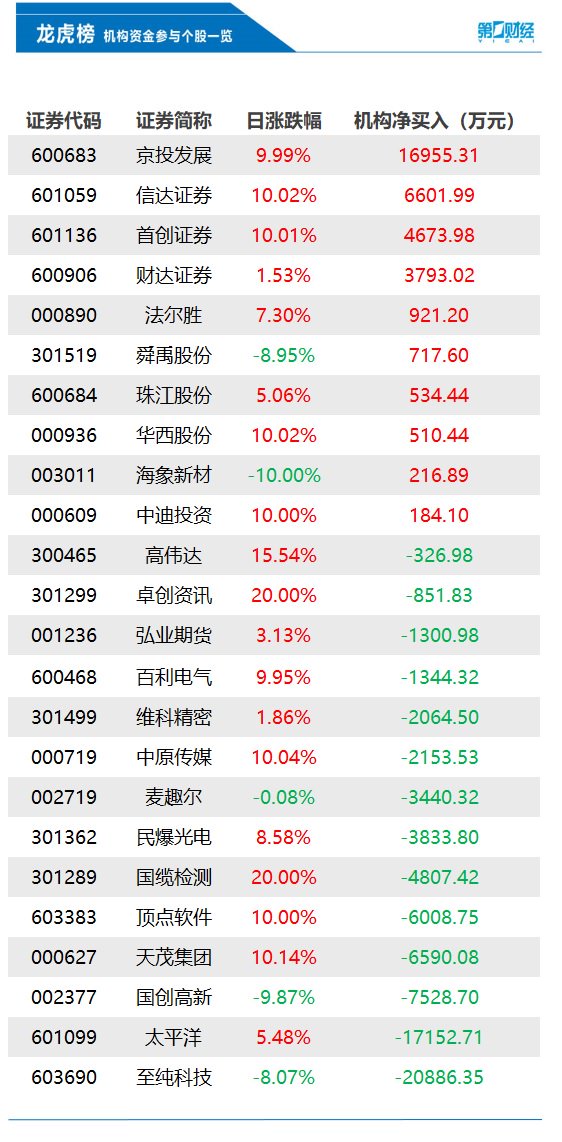 当天机构净买入前三的股票分别是京投发展、信达证券、首创证券,净买入金额分别是1.70亿元、6602万元、4674万元。