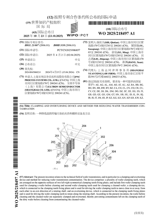 至纯科技公布国际专利申请:“一种降低晶圆传输污染的夹持和翻转设备及方法”