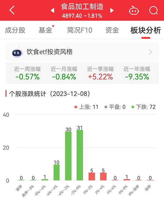 中国经济网北京12月8日讯 今日,食品加工制造板块整体跌幅1.81%,其中,11只股票上涨,0只股票平盘,72只股票下跌。