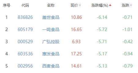 盖世食品、一鸣食品、广弘控股、惠发食品、西麦食品位列涨幅榜后五位,涨幅分别为-6.14%、-5.72%、-5.71%、-5.17%、-5.13%。