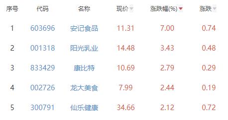 其中,安记食品、阳光乳业、康比特、龙大美食、仙乐健康位列板块涨幅前五位,涨幅分别为7.00%、3.43%、2.79%、2.44%、2.12%。