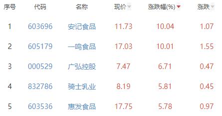 其中,安记食品、一鸣食品、广弘控股、骑士乳业、惠发食品位列板块涨幅前五位,涨幅分别为10.04%、10.01%、6.71%、5.81%、5.78%。