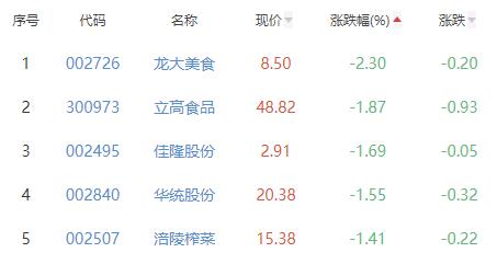 龙大美食、立高食品、佳隆股份、华统股份、涪陵榨菜位列涨幅榜后五位,涨幅分别为-2.30%、-1.87%、-1.69%、-1.55%、-1.41%。