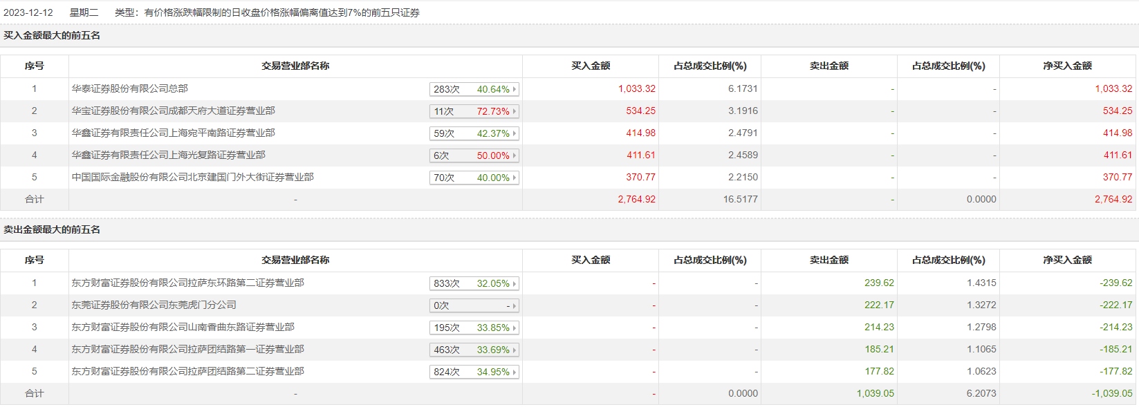 12月12日,安记食品今日涨停,龙虎榜数据显示,上榜营业部席位全天成交3803.97万元,占当日总成交金额比例为22.72%。其中,买入金额为2764.92万元,卖出金额为1039.05万元,合计净买入1725.88万元。