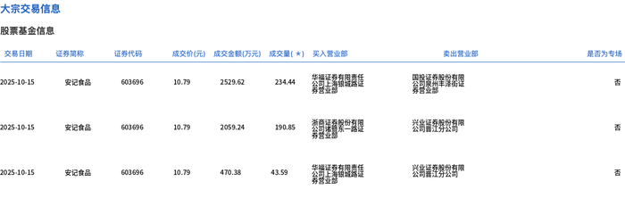 10月15日,安记食品大宗交易成交468.88万股,成交额5059.24万元,占当日总成交额的29.7%,成交价10.79元,较市场收盘价12.27元折价12.06%。