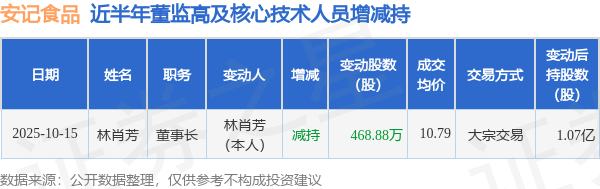 安记食品:10月15日高管林肖芳减持股份合计468.88万股
