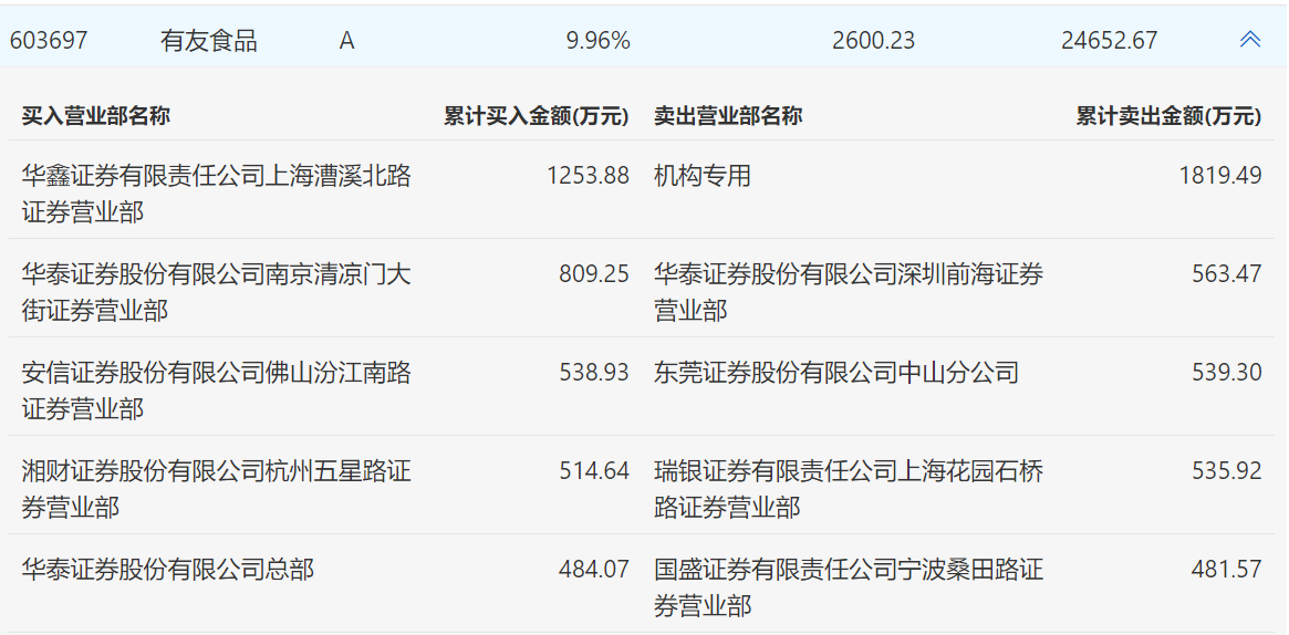 有友食品12月1日涨停,龙虎榜数据显示,上榜营业部席位全天成交7540.55万元,占当日总成交金额比例为30.59%。其中,买入金额为3600.78万元,卖出金额为3939.77万元,合计净卖出338.99万元。