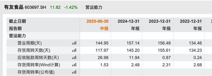 如果把时间线拉长,这种“不足”更加明显。据wind数据,2022年6月-2025年6月这4年中报数据显示,有友食品应收账款分别为47.87万元、217.1万元、1376万元、1.57亿元;周转天数分别为0.17天、0.57天、2.98天、26.98天,周转率分别为1039次、314.3次、60.34次、6.67次。