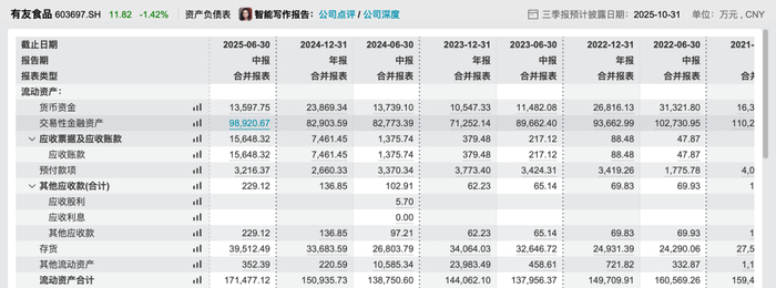 目前,有友食品有较为充分的现金流保障。2025年上半年,其经营活动现金流净额同比增长15.22%,与此同时,其17.15亿元流动资产中,有9.89亿元为交易性金融资产。