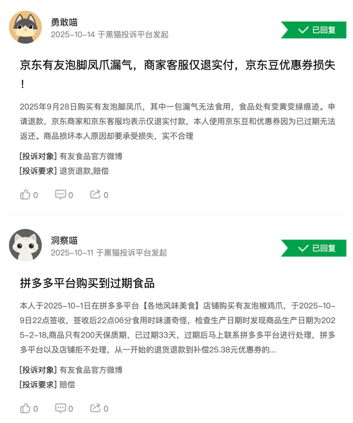 但值得警惕的是,有友食品的食品质量关。从网上投诉来看,消费者在购买有友食品后吃出的异物可谓五花八门——头发、虫子、鸡毛、钢丝、螺丝钉……黑猫投诉[下载黑猫投诉客户端]平台上,也有不少关于有友泡凤爪漏气、买到过期食品的投诉。