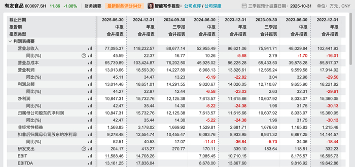 2025年上半年,有友食品业绩延续增长态势。营业收入和归母净利润双双大增,分别为7.71亿元、1.08亿元,同比分别增长45.59%,42.47%,经营活动产生的现金流量净额1.37亿元,同比增长15.22%。