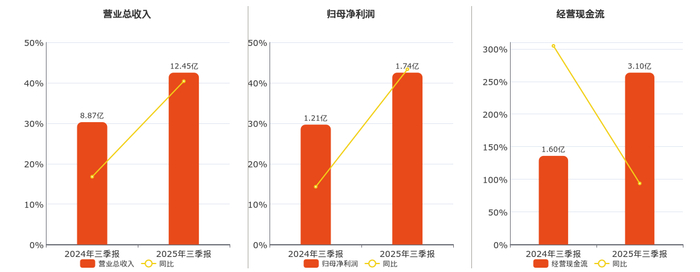 公司营业总收入为12.45亿元,在已披露的同业公司中排名第19。归母净利润为1.74亿元。经营活动现金净流入为3.10亿元。