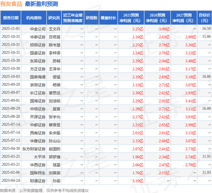 西南证券股份有限公司朱会振,舒尚立近期对有友食品进行研究并发布了研究报告《2025年三季报点评:25Q3延续高增,后续高弹性可期》,给予有友食品买入评级。