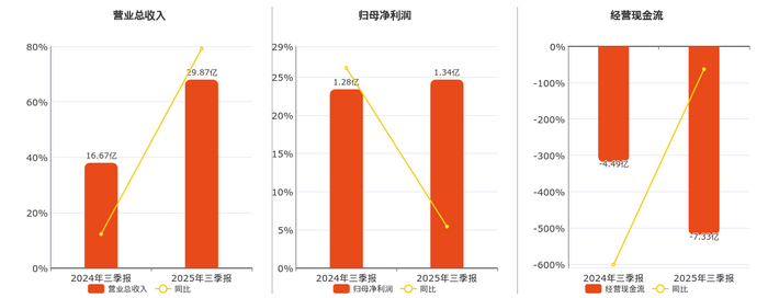 公司营业总收入为29.87亿元,在已披露的同业公司中排名第24,较去年同报告期营业总收入增加13.20亿元,实现5年连续上涨,同比较去年同期上涨79.16%。归母净利润为1.34亿元,在已披露的同业公司中排名第34,较去年同报告期归母净利润增加691.59万元,实现5年连续上涨,同比较去年同期上涨5.42%。经营活动现金净流入为-7.33亿元。