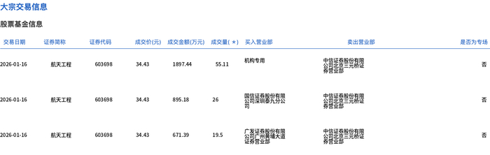 1月16日,航天工程大宗交易成交100.61万股,成交额3464.01万元,占当日总成交额的1.36%,成交价34.43元,较市场收盘价40.13元折价14.2%。