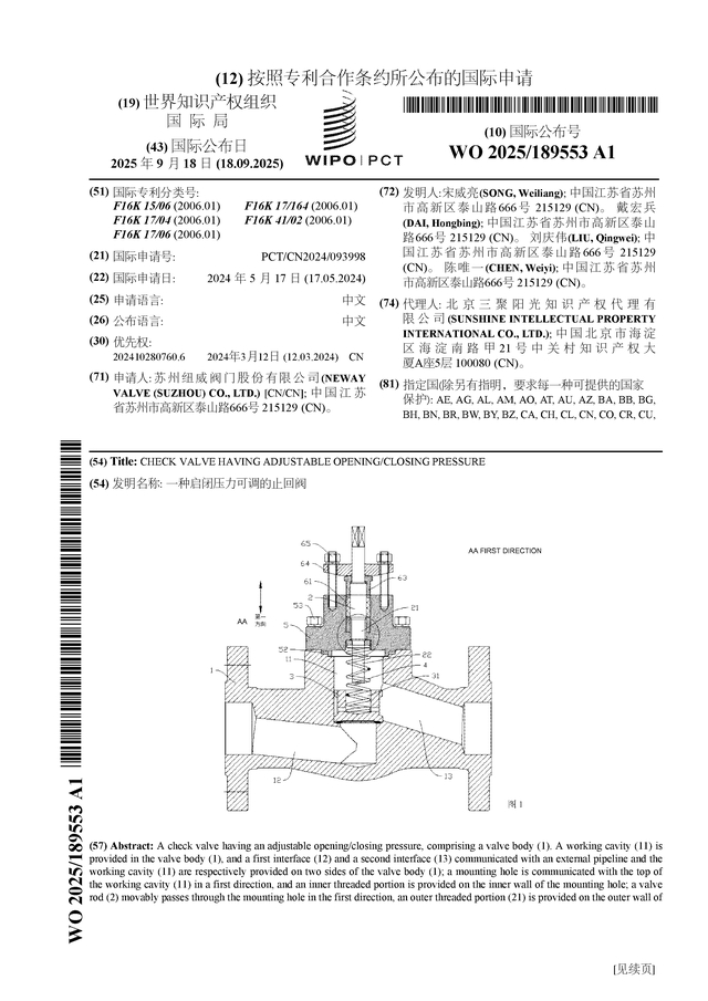 纽威股份公布国际专利申请:“一种启闭压力可调的止回阀”