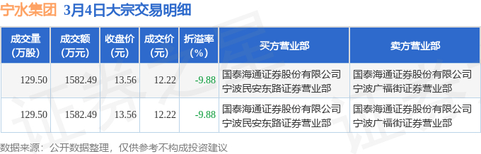 3月4日宁水集团现3164.98万元大宗交易