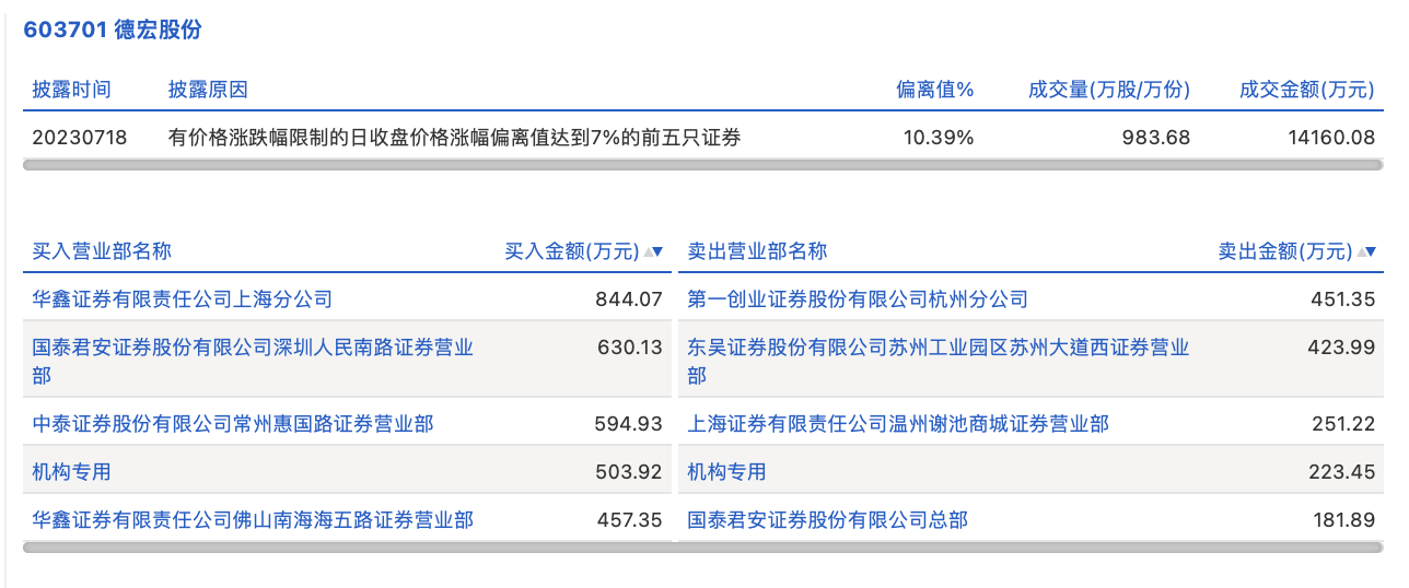 7月18日,德宏股份今日涨停,龙虎榜数据显示,上榜营业部席位全天成交4562.31万元,占当日总成交金额比例为32.22%。其中,买入金额为3030.4万元,卖出金额为1531.91万元,合计净买入1498.5万元。