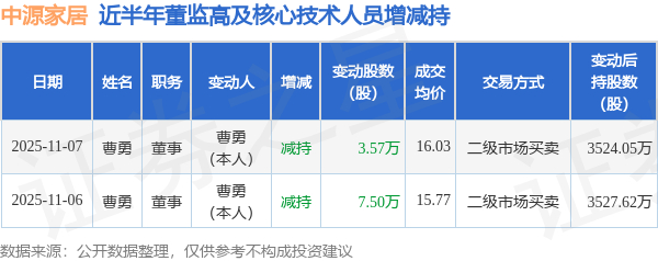 中源家居:11月7日高管曹勇减持股份合计3.57万股