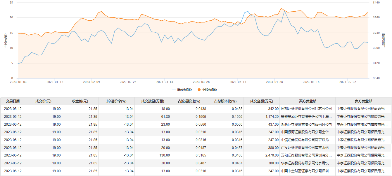 6月12日大宗交易成交311.8万股,成交额5924.2万元,占当日总成交额的41.97%,成交价19元,较市场收盘价21.85元折价13.04%。