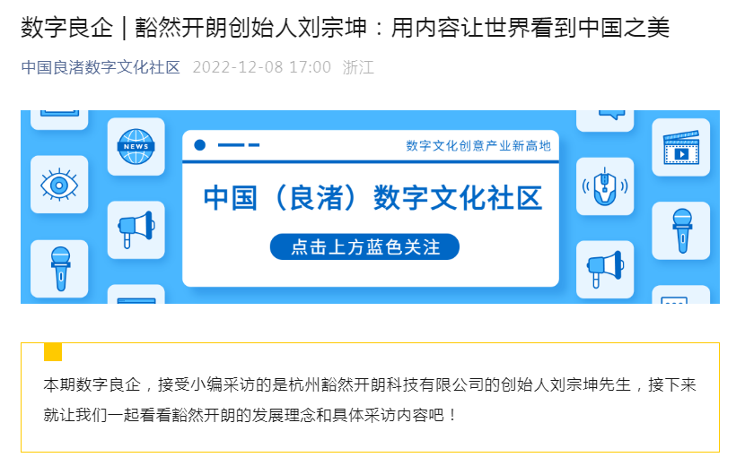 2022年12月8日,中国良渚数字文化社区公众号发布了一篇豁然开朗创始人刘宗坤的采访文章。