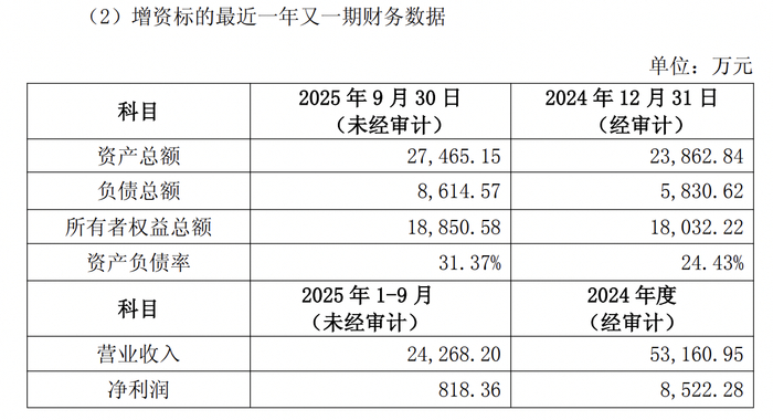 2025年前9月,增资标的营业收入为2.43亿元,净利润为818.36万元。截至2025年9月末,增资标的资产总额2.75亿元,负债总额8614.57万元,负债率为31.37%。