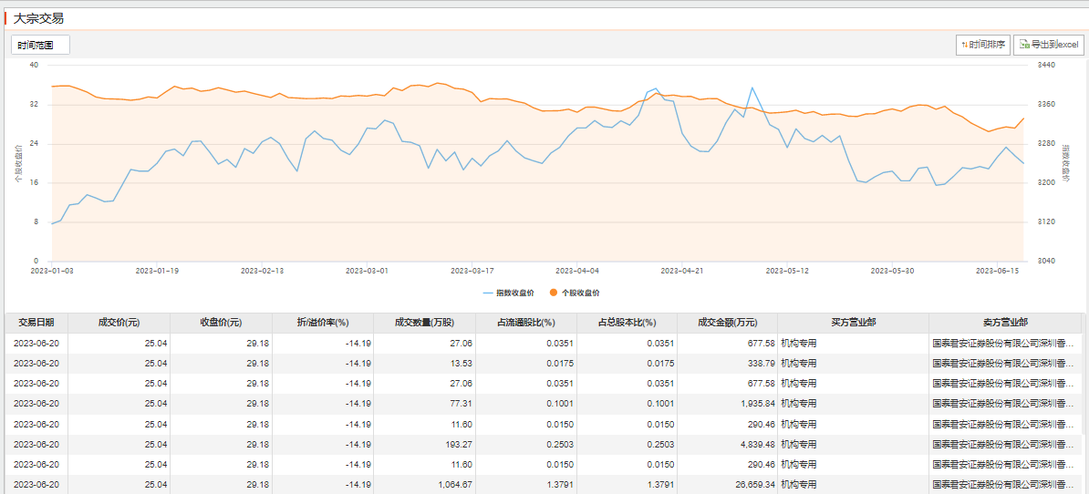6月20日大宗交易成交1544万股,成交额3.87亿元,占当日总成交额的39.76%,成交价25.04元,较市场收盘价29.18元折价14.19%。